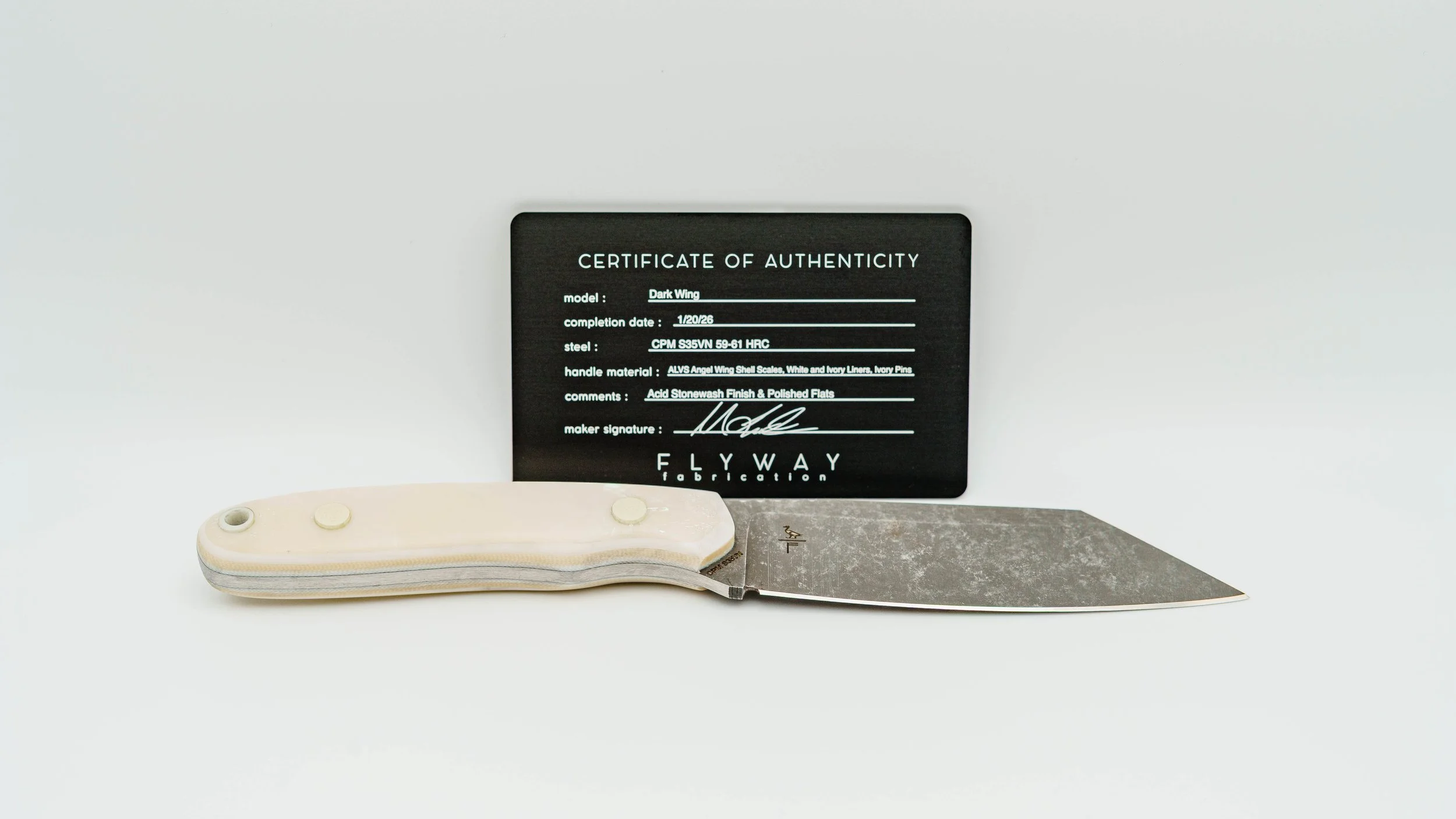 CPM S35VN - ALVS Angel Wing Shell Scales - White & Ivory G10 Liners - Ivory G10 Pins - Acid Stonewash Finish