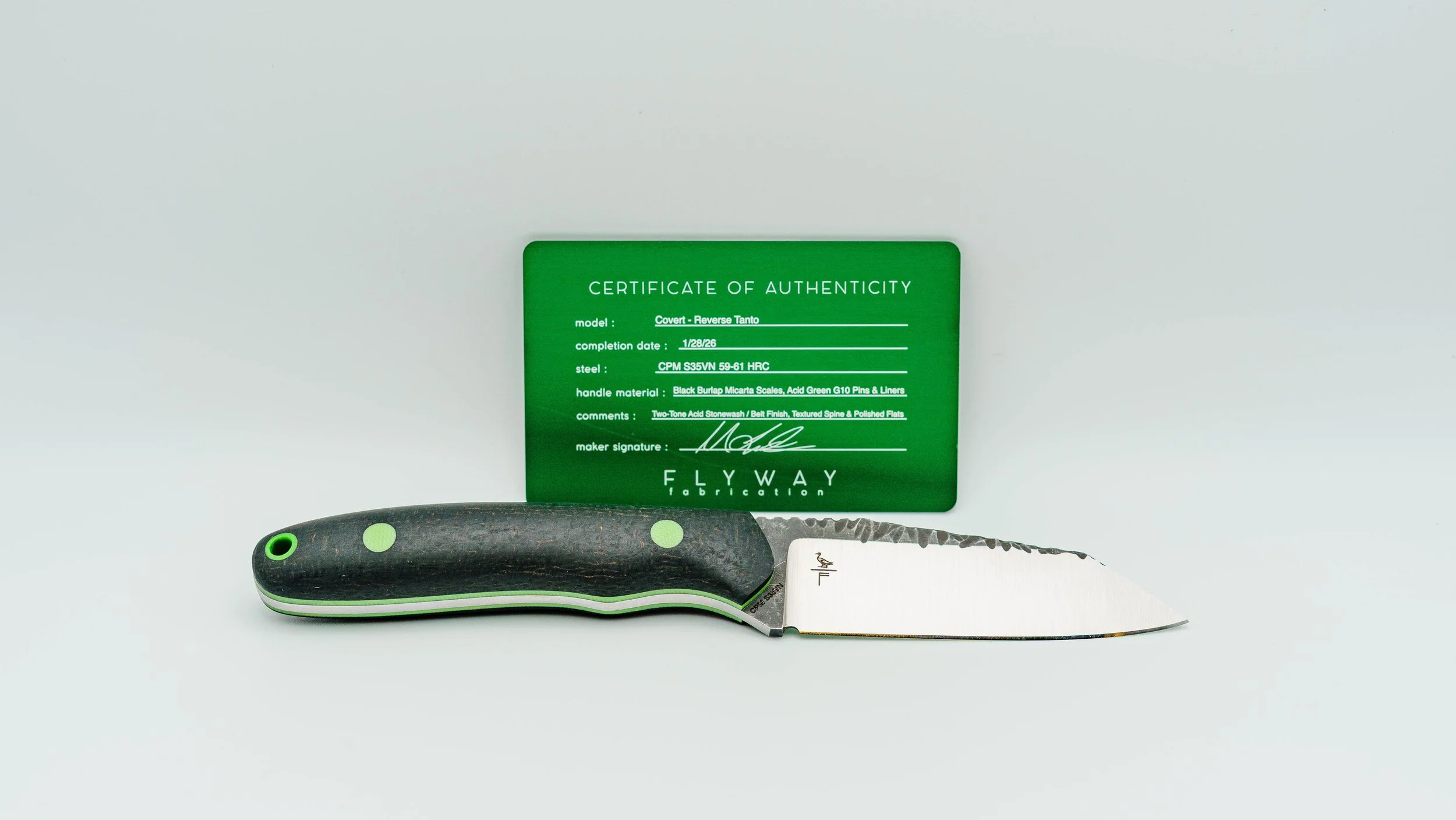 CPM S35VN - Black Burlap Micarta Scales - Acid Green G10 Liners & Pins - Two-tone Acid Stonewash/Belt Finish - Textured Spine