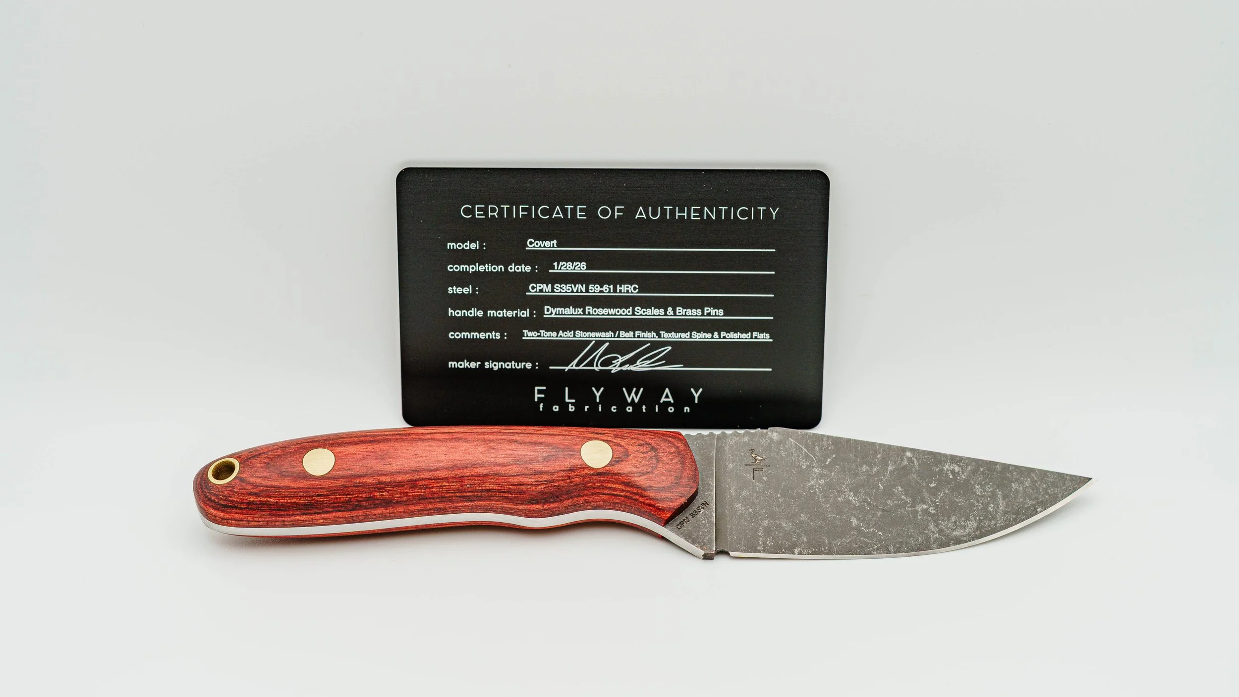 CPM S35VN - Dymalux Rosewood Scales - Brass Pins - Acid Stonewash Finish