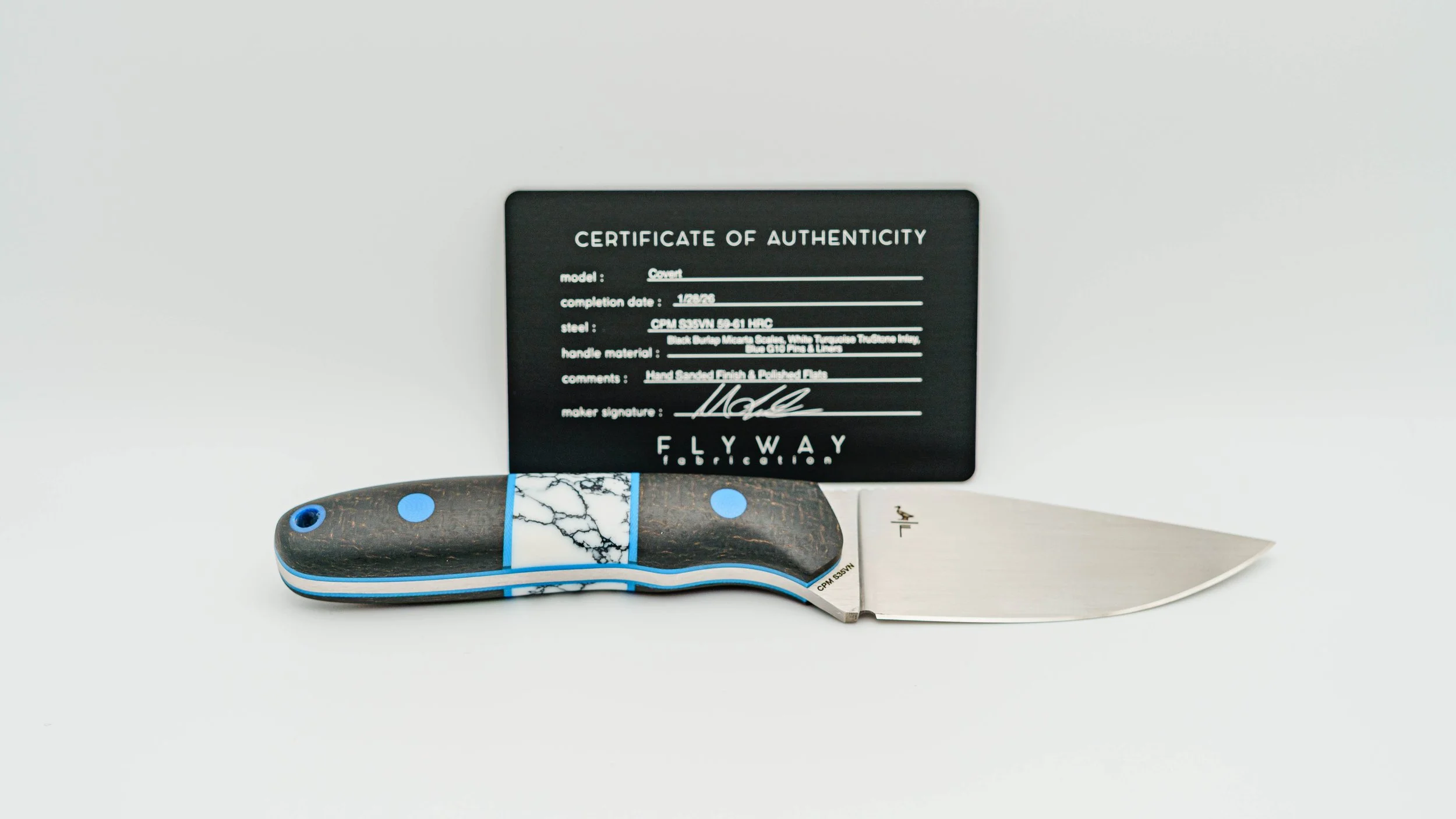 CPM S35VN - Black Burlap Micarta & White Turquoise TruStone Inlay - Blue G10 Pins & Liners - Hand Sanded Finish